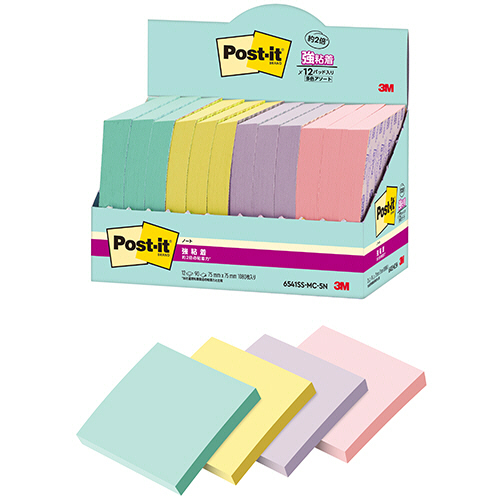 ●75×75mmのノートサイズ・強粘着ふせん。90枚×12冊パック。