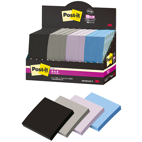 ●75×75mmのノートサイズ・強粘着ふせん。90枚×9冊+70枚×3冊(ブラックのみ)パック。