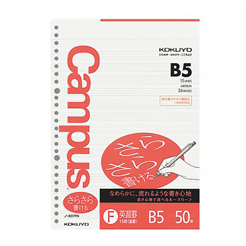 ●「さらさら書ける」タイプのルーズリーフ。B5・英習罫15段(並罫)の50枚×5パックセットです。