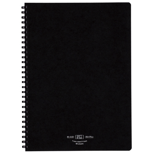 ●コクヨ独自開発の「やわらかリング」を採用したリングノートです。気軽に使いやすい普通横罫(7mm)を採用、セミB5サイズ・表紙色はブラックです。5冊セットです。