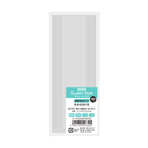 焼き菓子などの個包装に最適な透明ガス袋。サイズは厚さ0.055×幅55(全体幅80・マチ25)×高さ150mmです。