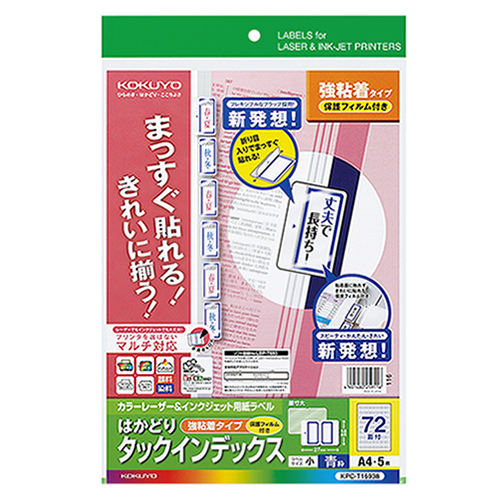 ●A4サイズ、72面付け、青枠の保護フィルム付強粘着タックインデックス(小)です。5シート×5冊セット。