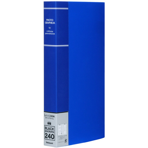 ●便利なスリップケース入りのフォトグラフィリア。L判240枚(またはKG・パノラマ判80枚)収容、色はブルーです。