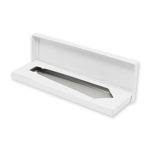ネクタイのパッケージ・ギフト包装によく使われる箱。高級な印象のホワイト仕様で、蓋には光沢があります。中枠の窓がネクタイ状にくり抜かれており、パッケージ・ギフトラッピングにピッタリです。