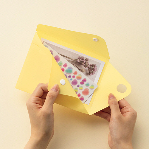 収容物を守るフタとホックが付いたハガキサイズの不透明カラーホルダー。