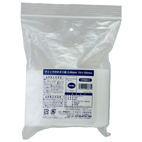 ●厚さ0.08mm、ヨコ70×タテ100mmのチャック付ポリ袋。100枚入です。