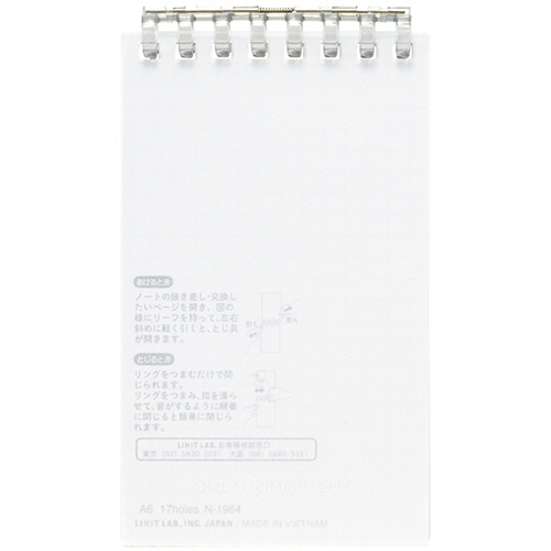●とじ具が開くのでリーフの差替えが可能なオープンリングノート。メモサイズ、色はクリヤーです。