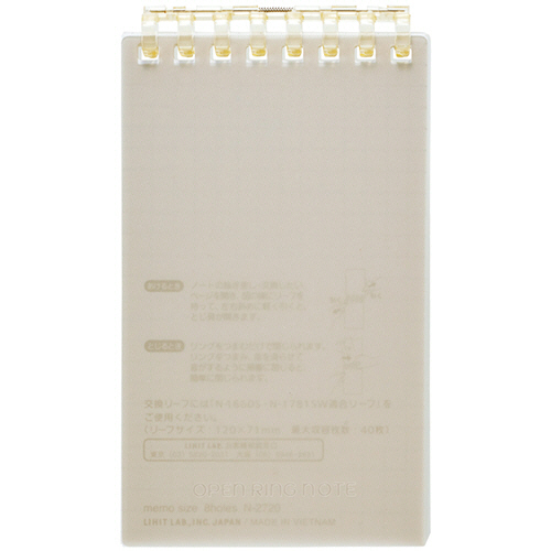 ●とじ具が開くのでリーフの差替えが可能なオープンリングノート。メモサイズ、色はブラウンです。