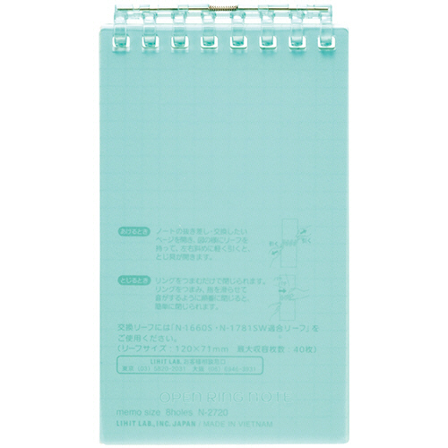 ●とじ具が開くのでリーフの差替えが可能なオープンリングノート。メモサイズ、色はグリーンです。