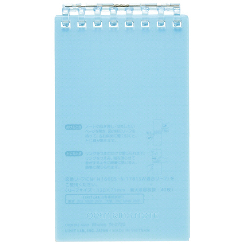 ●とじ具が開くのでリーフの差替えが可能なオープンリングノート。メモサイズ、色はライトブルーです。
