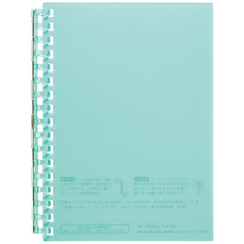 ●とじ具が開くのでリーフの差替えが可能なオープンリングノート。A6タテ型、色はグリーンです。