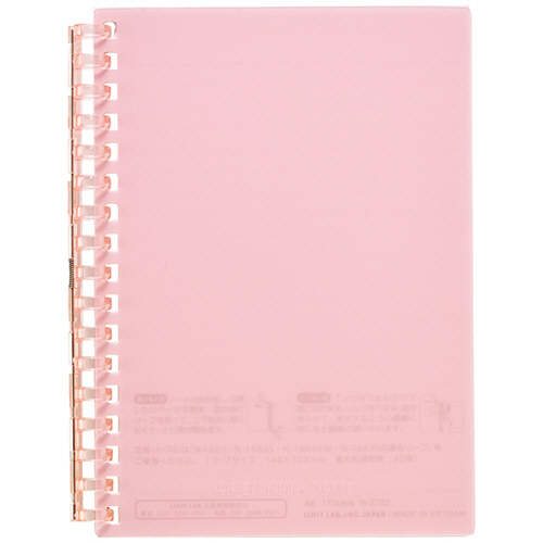 ●とじ具が開くのでリーフの差替えが可能なオープンリングノート。A6タテ型、色はピンクです。
