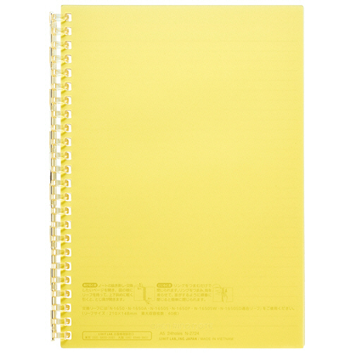 ●とじ具が開くのでリーフの差替えが可能なオープンリングノート。A5タテ型、色はイエローです。