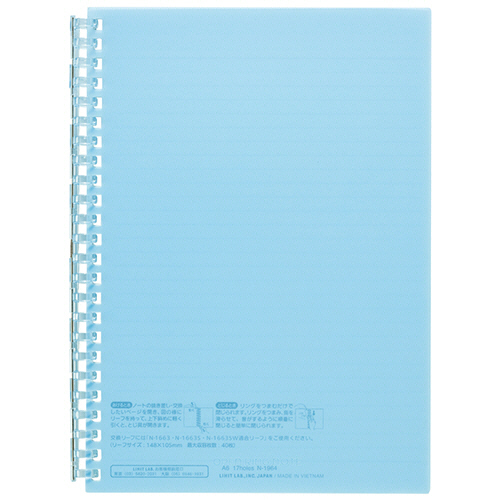 ●とじ具が開くのでリーフの差替えが可能なオープンリングノート。A5タテ型、色はライトブルーです。