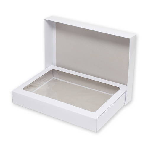 バスタオルなどのパッケージ・ギフト包装によく使われる箱。高級な印象のホワイト仕様で、蓋には光沢があります。中枠がフィルム貼りとなっており、パッケージ・ギフトラッピングにピッタリです。