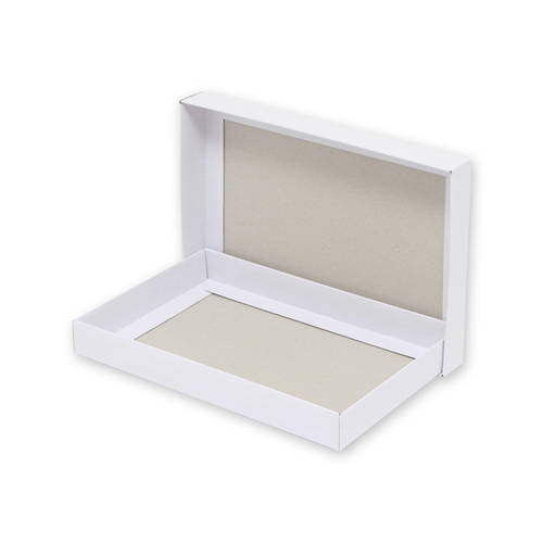 2枚組になったハンカチのパッケージ・ギフト包装によく使われる箱。高級な印象のホワイト仕様で、蓋には光沢があります。ギフトセットのパッケージやラッピングにピッタリです。