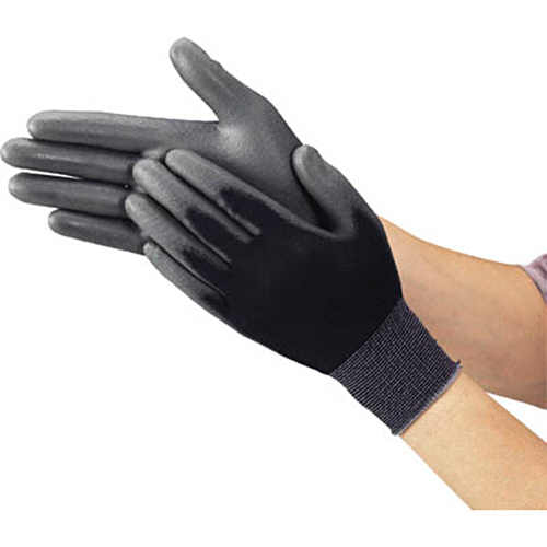●手袋部:ナイロン100%●すべり止め部:ポリウレタン(PUR)●サイズ:L●全長(cm):22.5●手のひら周り(cm):18.8●中指長さ(cm):7.6●色:ブラック●厚み:0.9mm●食品衛生法適合品