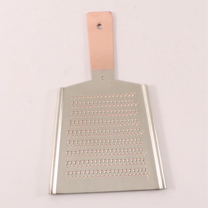 職人が手作業でひとつずつ目立てした本職仕様の卸金です。叩いて硬くした銅板にひとつずつ鏨(たがね)で目立てをしているので、刃が鋭く仕上がっています。手作業の目立てのため刃が不規則に並んでおり同じ場所を何回往復しても、鋭く切れ味の良い刃が触れて程よく水分を含んだ大根おろしが作れます。切れ味が良いと細胞を潰さない為、旨みを逃さず、素材の味がそのまま生かされます。材質:銅板スズメッキ品番:062084