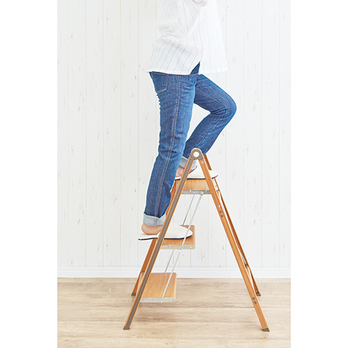 ●インテリアにもなじみやすい、木目柄がおしゃれな脚立です。アルミ製で軽く、持ち運びも楽々。