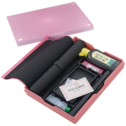 ●カチッとしっかり止めるロック機構付のケースに入った書道用品セット。ケースの色はクリアピンクラメです。