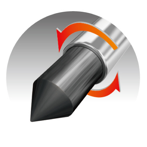 ●マークの動きで芯の回転がわかる。芯を紙に押しつけて離すたびに芯が9度回って、芯先が均一に摩耗します。