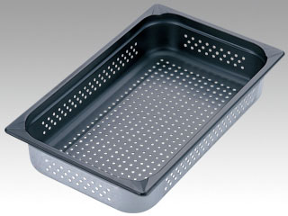 KINGO(キンゴー)ステンレスホテルパン。お手入れ簡単!ノンスティック加工!抜群の作業性と確かな安全性!まさにパーフェクトなホテルパン!変形しにくい様に、コーナー部分を補強!コーナー部分の凹みは変形や密着を防ぐだけでなく、他のホテルパンや容器への移し替えをする時の注ぎ口としてもご使用いただけるようにデザインされています。特許申請済。公開番号:特開2005-239286。