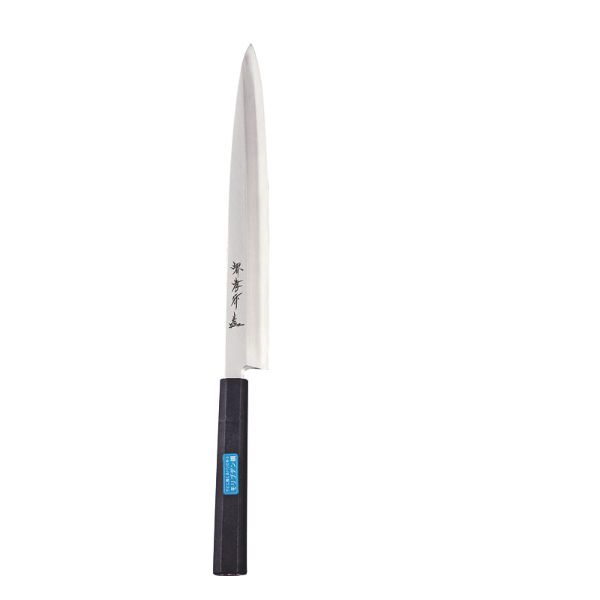 柄にプラスチック特殊樹脂を施した、衛生面と耐久性に優れた和包丁です。サイズ:刃渡270mm材質:モリブデン鋼、特殊樹脂六角半丸柄270mm