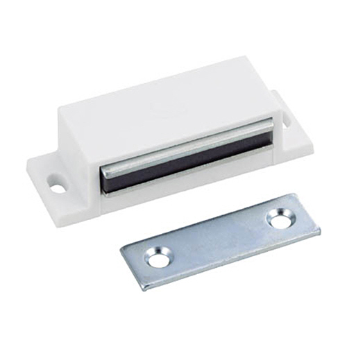 ●本体:ポリプロピレン(PP)●受け金具:スチール●マグネット:フェライト磁石(等方性)●色:白●全長(mm):60●吸着力(N):50●受板用推奨皿ねじ:2.7mm●本体取付穴寸法:3.5×6mm長穴