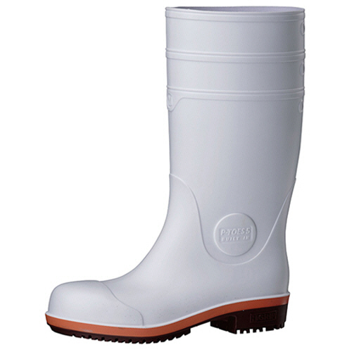 水や油で滑りやすい環境で履かれることの多い作業用長靴に耐滑性を搭載した「ハイグリップ長靴」。台車の車輪が衝突しても小指部に乗り上げない特許取得の小指保護先芯。軽量な樹脂タイプ。