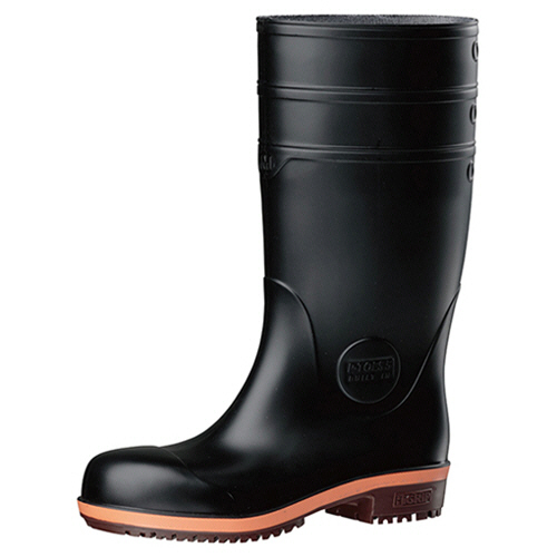 水や油で滑りやすい環境で履かれることの多い作業用長靴に耐滑性を搭載した「ハイグリップ長靴」。台車の車輪が衝突しても小指部に乗り上げない特許取得の小指保護先芯。軽量な樹脂タイプ。