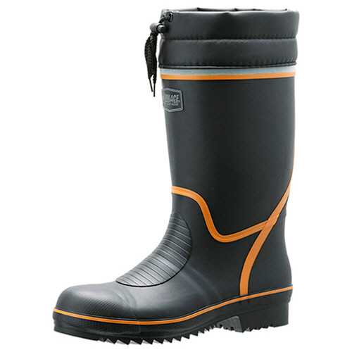 ●軽量でワイド、足にあたりにくい形状の先芯。樹脂製なので冷えやサビに強く、JIS T8101 L種に準拠した安全性能をもっています。ブラック×オレンジの24.0cmです。