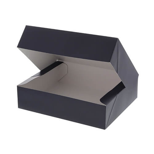 パッケージ包装によく使われる形式の箱。表面はマット調のダークブルーですが、箱を開けた内側はシンプルな白となっており、とてもシックな色合いです。洋服やアパレル雑貨などのパッケージ・ギフトラッピングにいかがでしょうか。