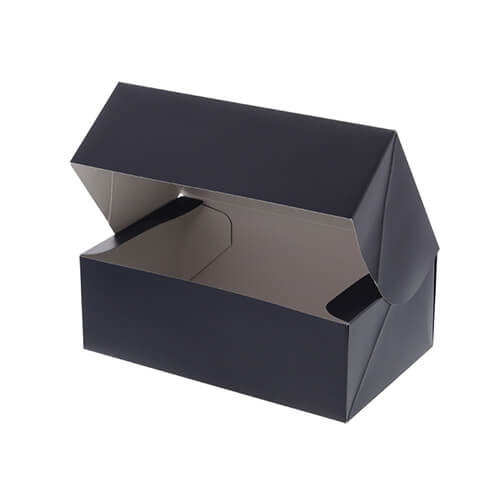 パッケージ包装によく使われる形式の箱。表面はマット調のダークブルーですが、箱を開けた内側はシンプルな白となっており、とてもシックな色合いです。洋服やアパレル雑貨などのパッケージ・ギフトラッピングにいかがでしょうか。