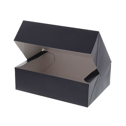 パッケージ包装によく使われる形式の箱。表面はマット調のダークブルーですが、箱を開けた内側はシンプルな白となっており、とてもシックな色合いです。洋服やアパレル雑貨などのパッケージ・ギフトラッピングにいかがでしょうか。