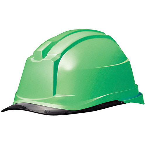 ●αライナー・クリアバイザー付PC製ヘルメット。色は帽体:グリーン、バイザー:スモークです。