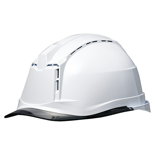 ●αライナー・クリアバイザー・通気孔付PC製ヘルメット。色は帽体:ホワイト、バイザー:スモークです。