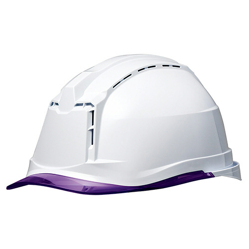 ●αライナー・クリアバイザー・通気孔付PC製ヘルメット。色は帽体:ホワイト、バイザー:パープルです。