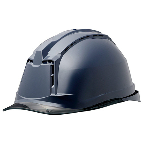 ●αライナー・クリアバイザー・通気孔付PC製ヘルメット。色は帽体:ネイビー、バイザー:スモークです。