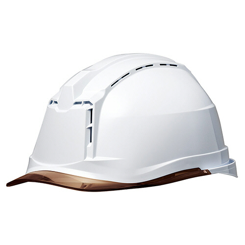 ●αライナー・クリアバイザー・通気孔付PC製ヘルメット。色は帽体:ホワイト、バイザー:ブラウンです。