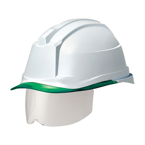 ●αライナー・クリアバイザー・シールド面付PC製ヘルメット。色は帽体:ホワイト、バイザー:グリーンです。
