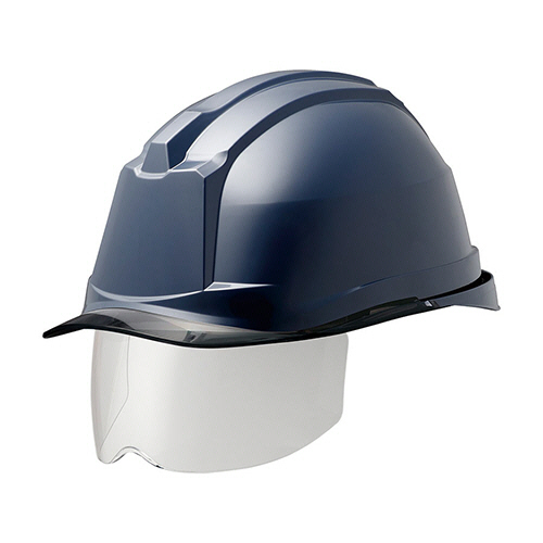 ●αライナー・クリアバイザー・シールド面付PC製ヘルメット。色は帽体:ネイビー、バイザー:スモークです。