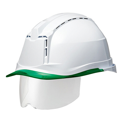 ●αライナー・クリアバイザー・シールド面・通気孔付PC製ヘルメット。色は帽体:ホワイト、バイザー:グリーンです。