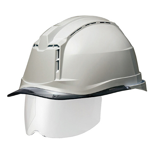 ●αライナー・クリアバイザー・シールド面・通気孔付PC製ヘルメット。色は帽体:グレー、バイザー:スモークです。