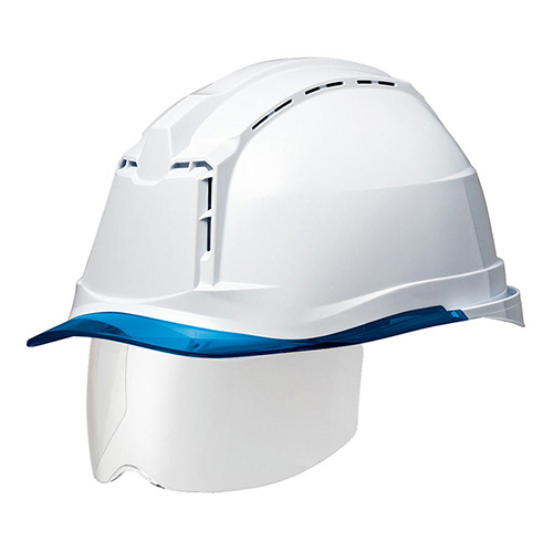 ●αライナー・クリアバイザー・シールド面・通気孔付PC製ヘルメット。色は帽体:ホワイト、バイザー:ブルーです。