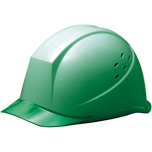 ●KP・通気孔・クリアバイザー付PC製ヘルメット。色は帽体・バイザー:グリーンです。