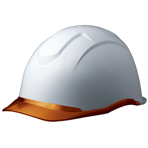 ●KP(衝撃吸収ライナー)・クリアバイザー付PC製ヘルメット。色は帽体:ホワイト、バイザー:オレンジです。