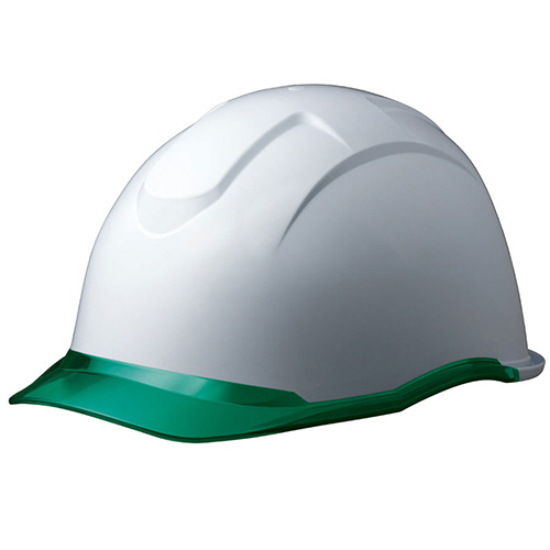 ●KP(衝撃吸収ライナー)・クリアバイザー付PC製ヘルメット。色は帽体:ホワイト、バイザー:グリーンです。