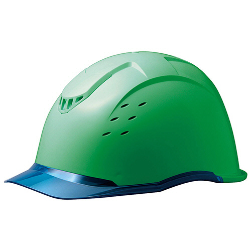 ●KP(衝撃吸収ライナー)・クリアバイザー・通気孔付PC製ヘルメット。色は帽体:グリーン、バイザー:ブルーです。