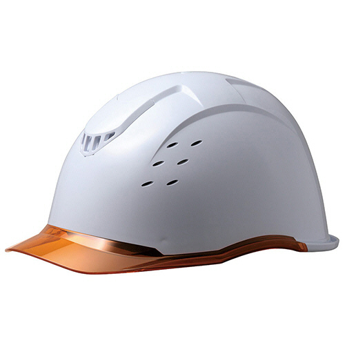 ●KP(衝撃吸収ライナー)・クリアバイザー・通気孔付PC製ヘルメット。色は帽体:ホワイト、バイザー:オレンジです。