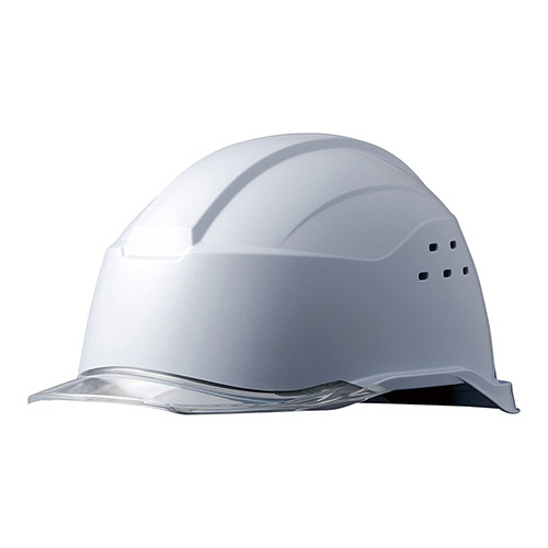 ●クリアバイザー・通気孔・KP(衝撃吸収ライナー)付PC製ヘルメット。色は帽体:ホワイト、バイザー:クリアです。